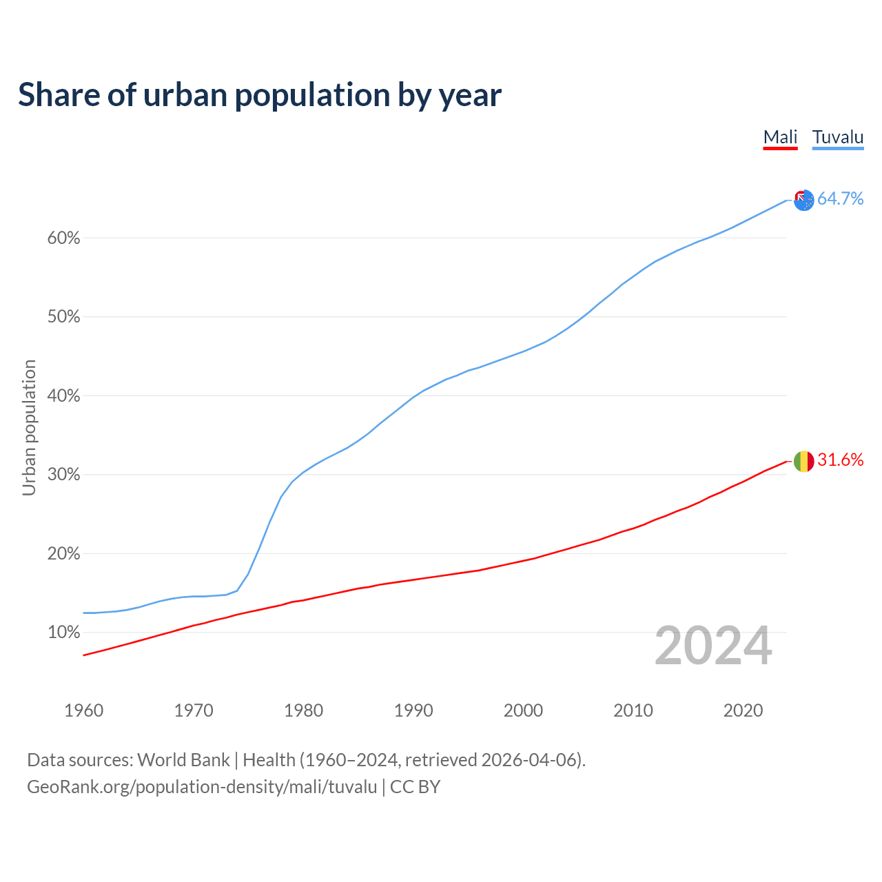 From 2004 to 2024, the share of urban population changed from 20.5% to 31.6% in Mali and from 48.4% to 64.7% in Tuvalu.