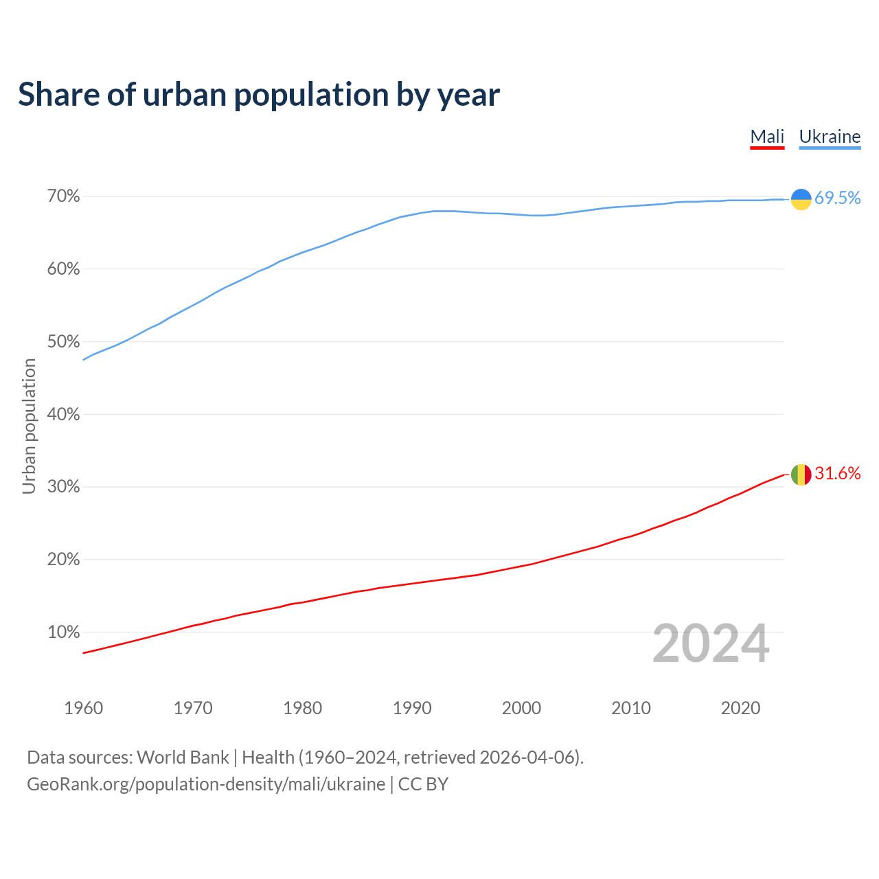 From 2004 to 2024, the share of urban population changed from 20.5% to 31.6% in Mali and from 67.6% to 69.5% in Ukraine.