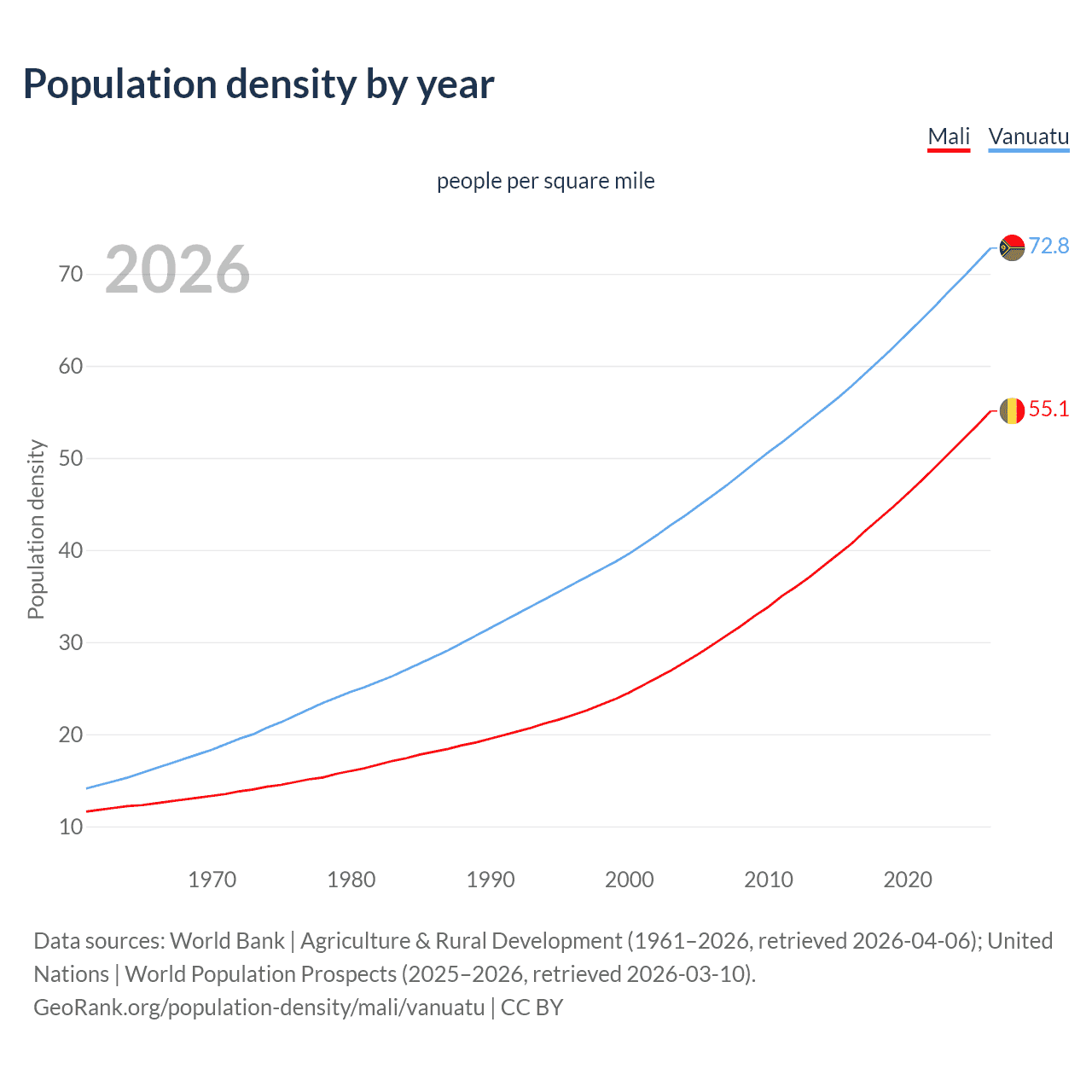 From 2006 to 2026, population density in Mali increased by 85.4%, compared to a 58.7% growth in Vanuatu.