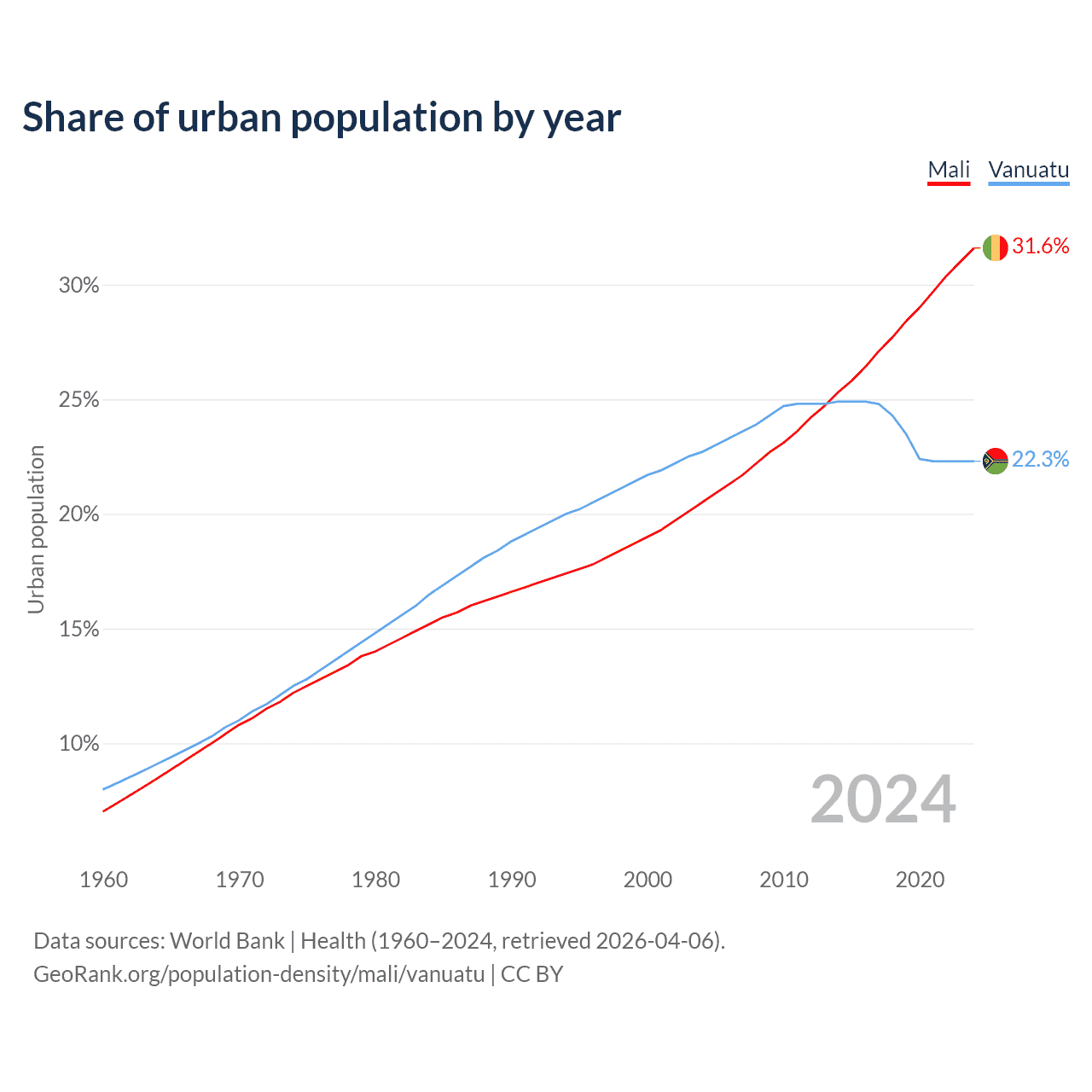 From 2004 to 2024, the share of urban population changed from 20.5% to 31.6% in Mali and from 22.7% to 22.3% in Vanuatu.