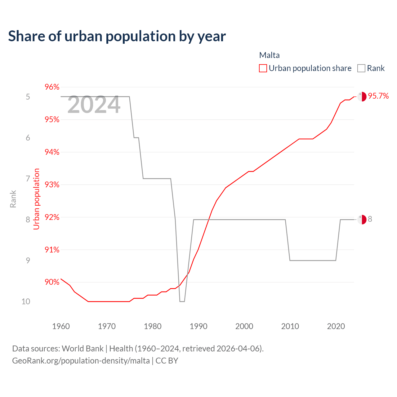 This chart shows the share of urban population in Malta from 1960 to 2024: 90.1% lived in urban areas in 1960, 93.3% in 2000, and 95.7% in 2024.