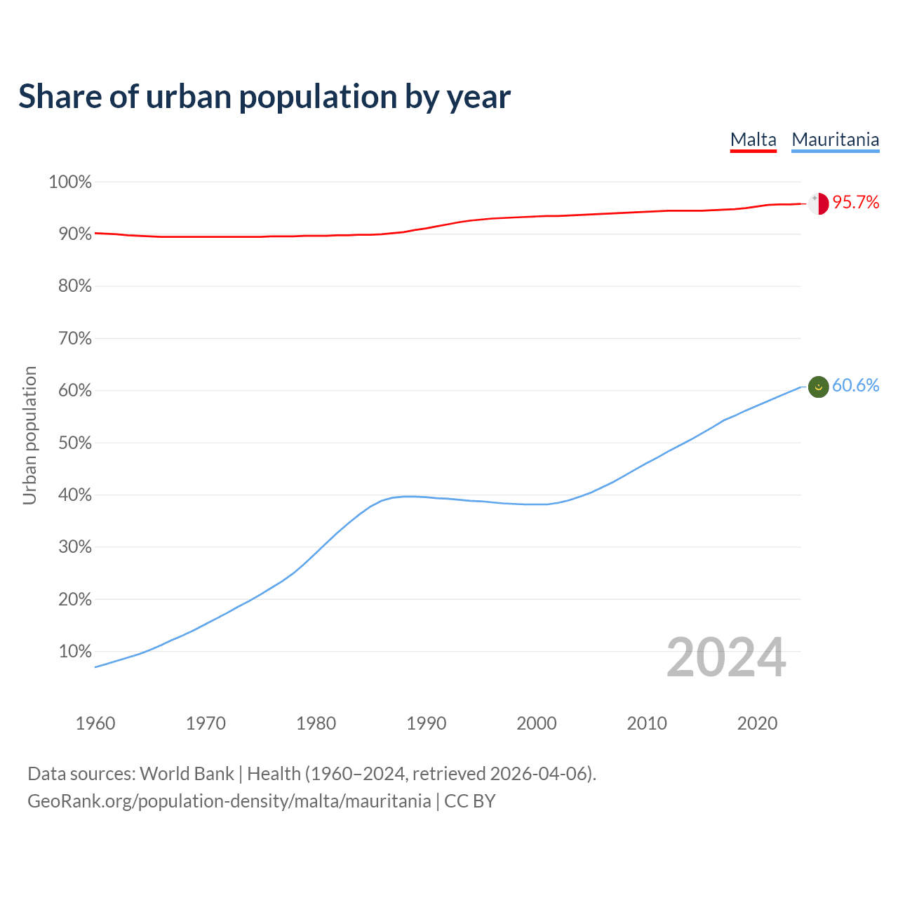 From 2004 to 2024, the share of urban population changed from 93.6% to 95.7% in Malta and from 39.6% to 60.6% in Mauritania.