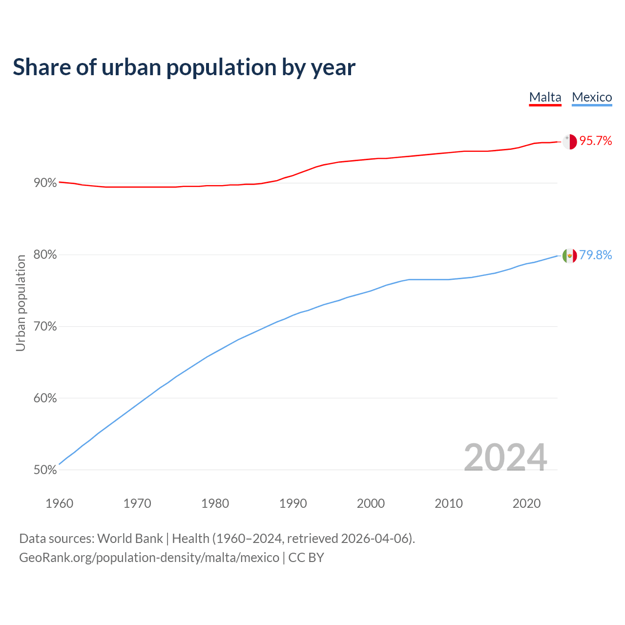 From 2004 to 2024, the share of urban population changed from 93.6% to 95.7% in Malta and from 76.3% to 79.8% in Mexico.