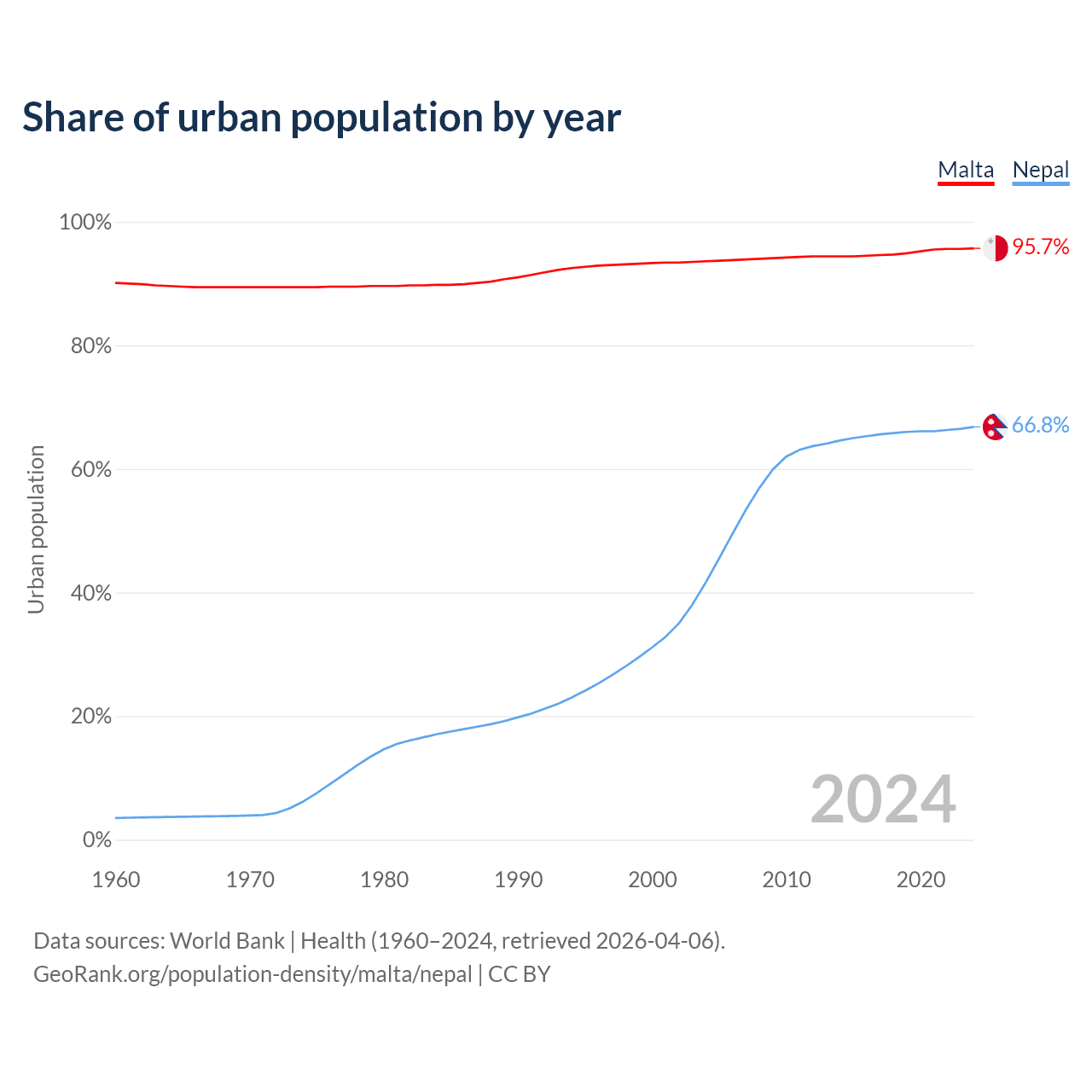 From 2004 to 2024, the share of urban population changed from 93.6% to 95.7% in Malta and from 41.6% to 66.8% in Nepal.
