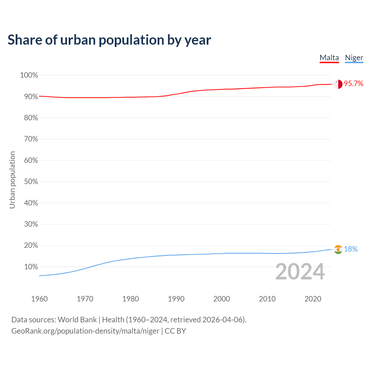 From 2004 to 2024, the share of urban population changed from 93.6% to 95.7% in Malta and from 16.3% to 18% in Niger.