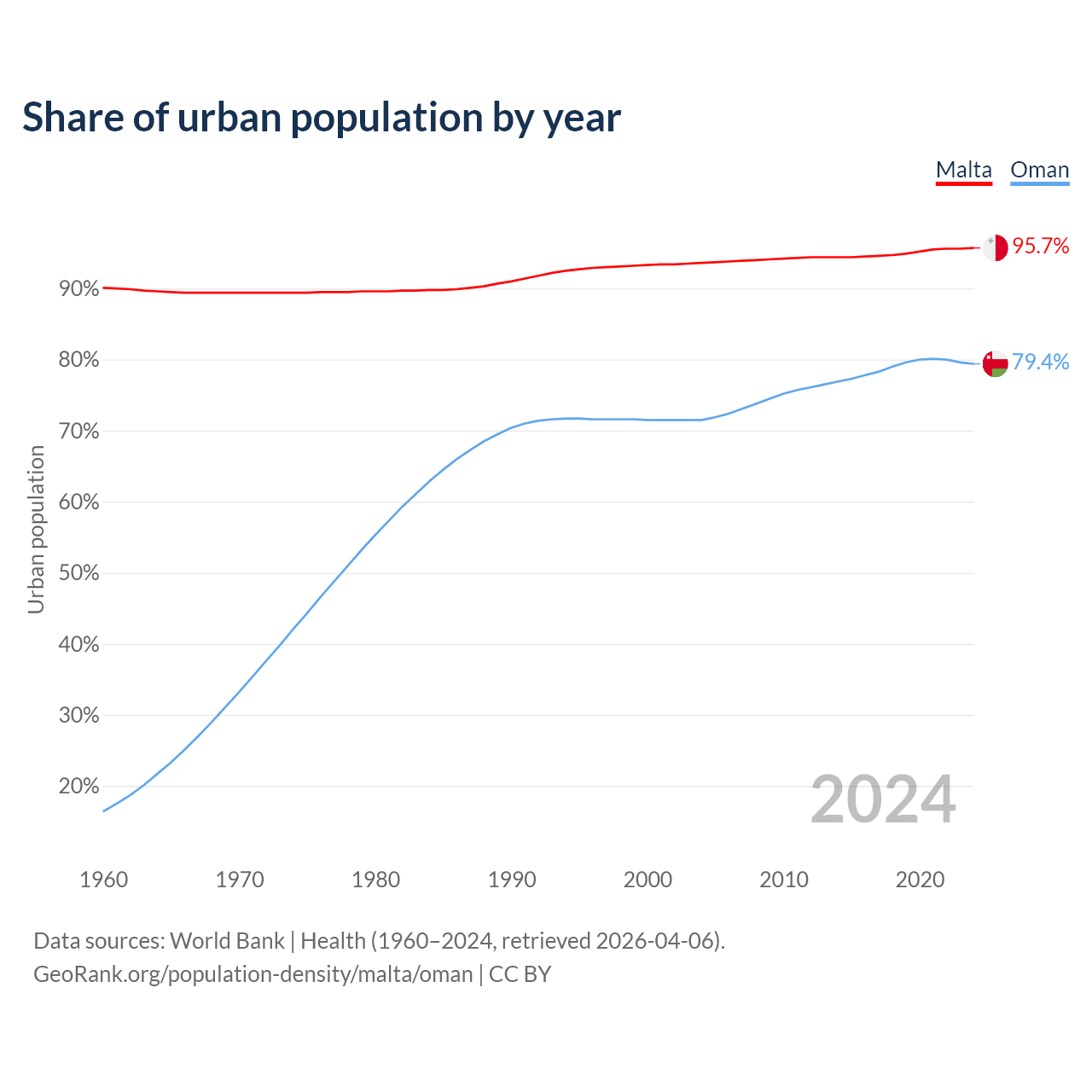 From 2004 to 2024, the share of urban population changed from 93.6% to 95.7% in Malta and from 71.5% to 79.4% in Oman.
