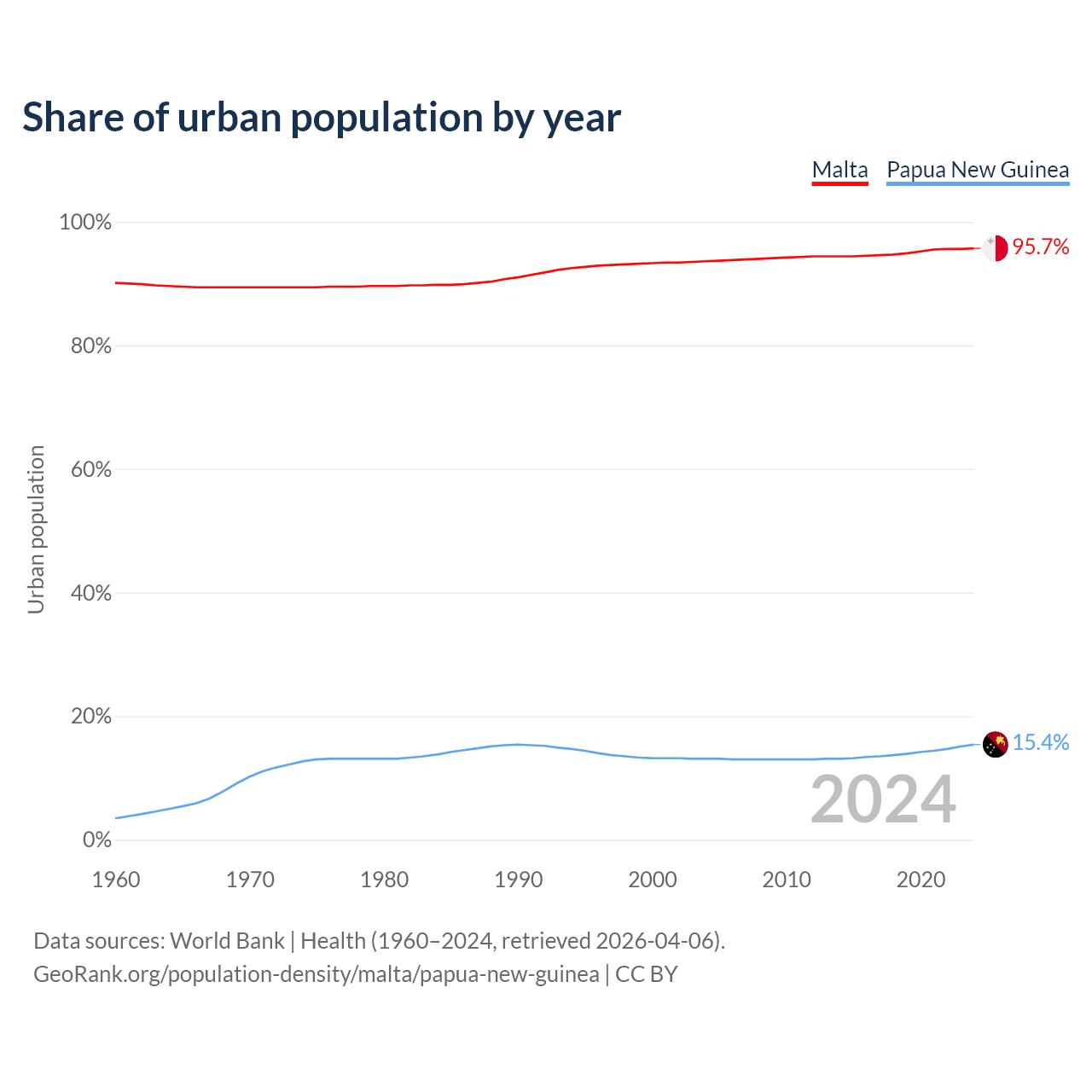 From 2004 to 2024, the share of urban population changed from 93.6% to 95.7% in Malta and from 13.1% to 15.4% in Papua New Guinea.
