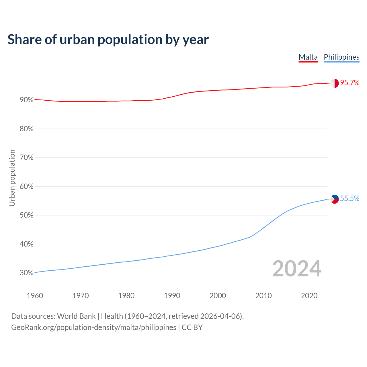From 2004 to 2024, the share of urban population changed from 93.6% to 95.7% in Malta and from 40.9% to 55.5% in the Philippines.