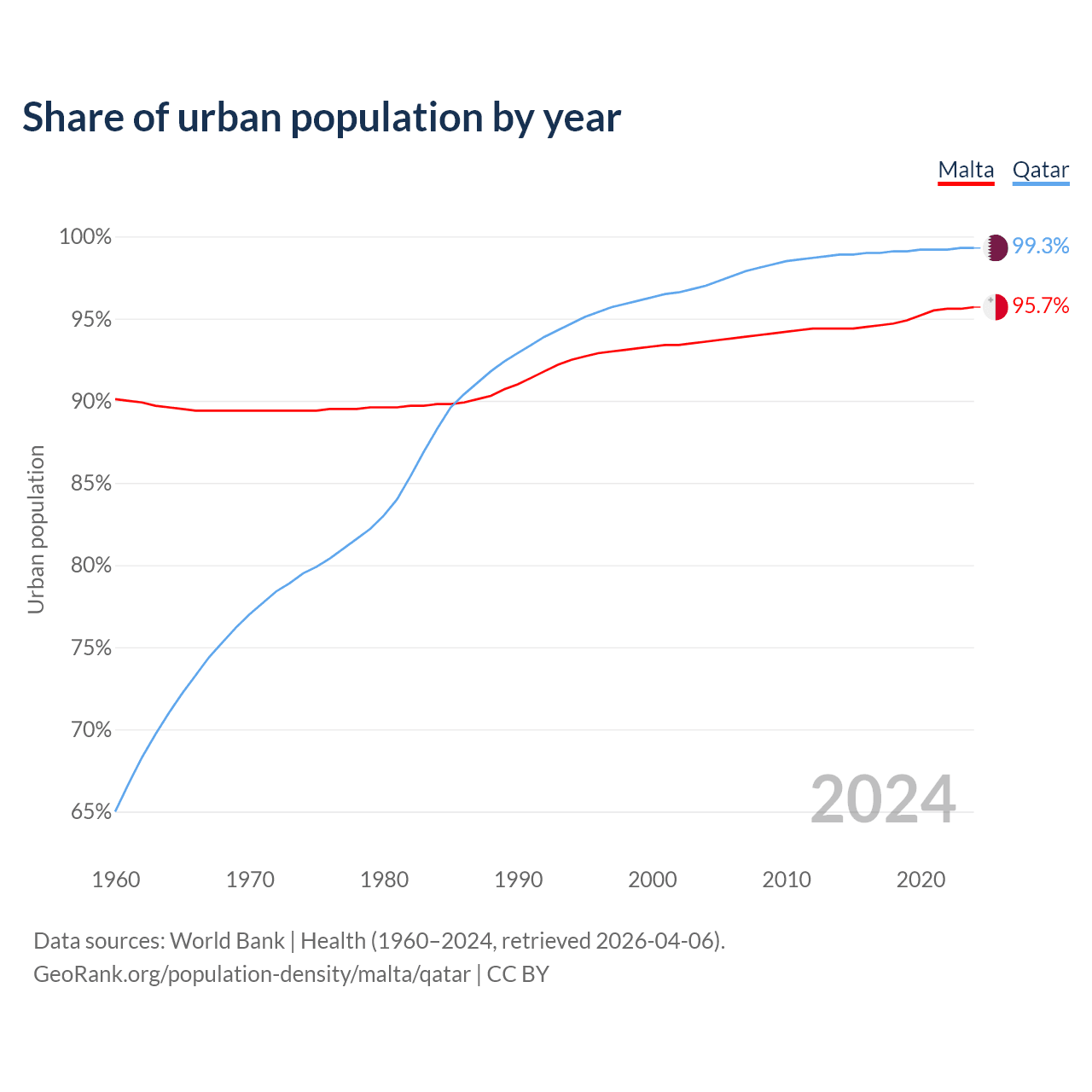 From 2004 to 2024, the share of urban population changed from 93.6% to 95.7% in Malta and from 97% to 99.3% in Qatar.