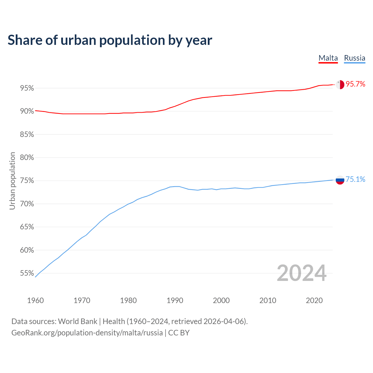 From 2004 to 2024, the share of urban population changed from 93.6% to 95.7% in Malta and from 73.3% to 75.1% in Russia.