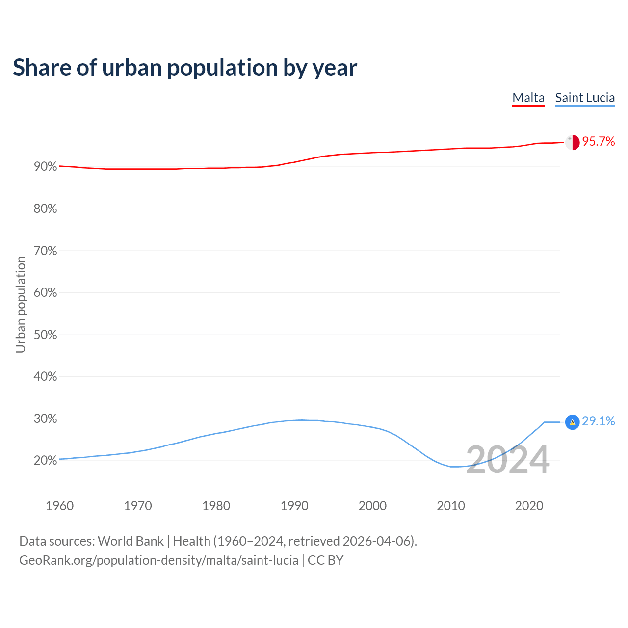From 2004 to 2024, the share of urban population changed from 93.6% to 95.7% in Malta and from 24.8% to 29.1% in Saint Lucia.