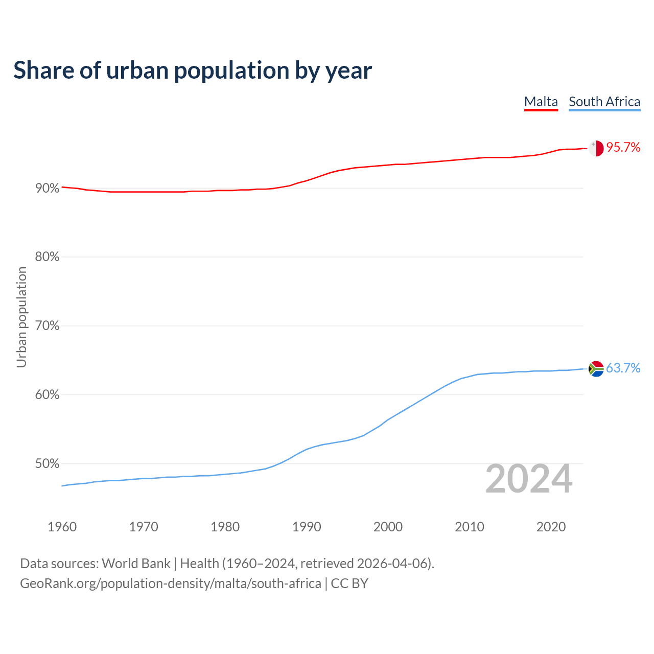 From 2004 to 2024, the share of urban population changed from 93.6% to 95.7% in Malta and from 59.1% to 63.7% in South Africa.