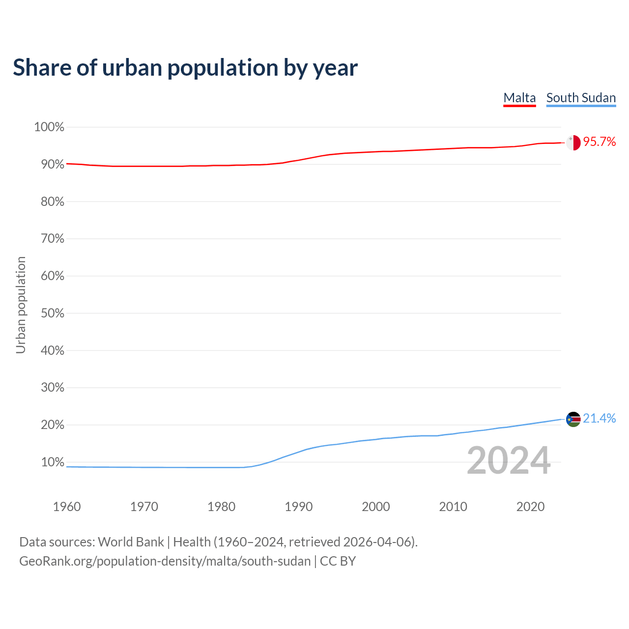 From 2004 to 2024, the share of urban population changed from 93.6% to 95.7% in Malta and from 16.8% to 21.4% in South Sudan.