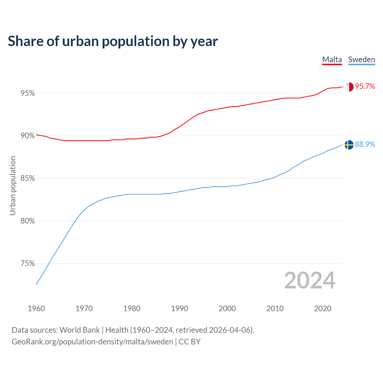 From 2004 to 2024, the share of urban population changed from 93.6% to 95.7% in Malta and from 84.3% to 88.9% in Sweden.