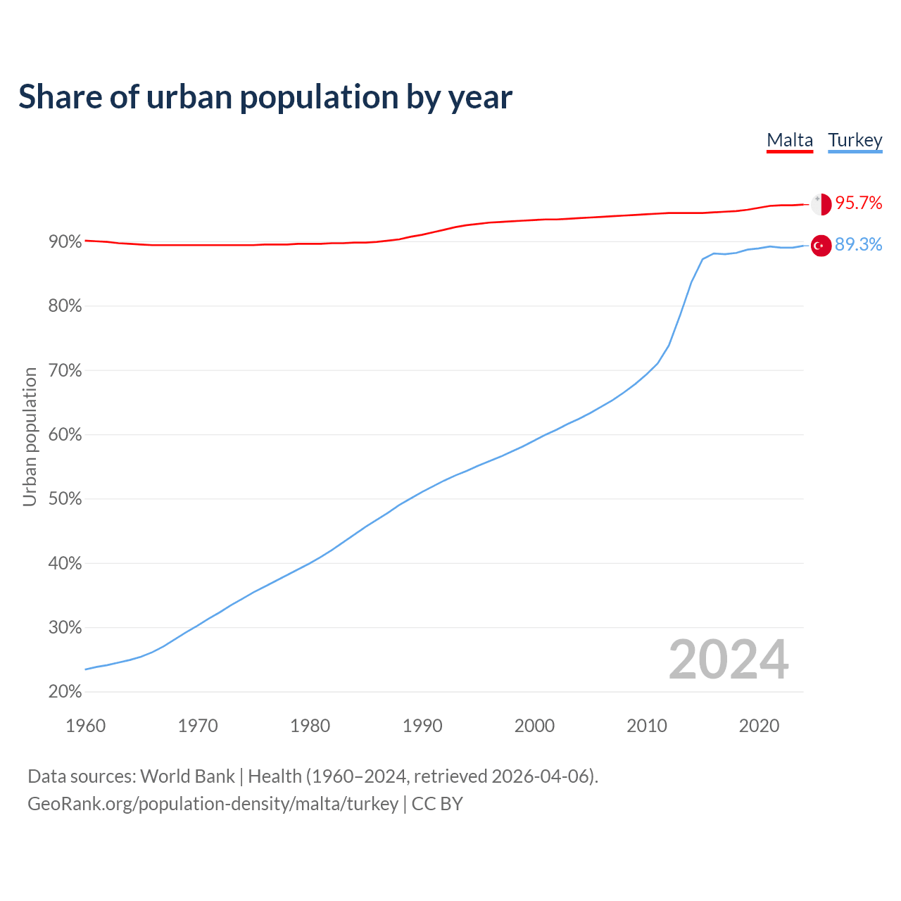 From 2004 to 2024, the share of urban population changed from 93.6% to 95.7% in Malta and from 62.4% to 89.3% in Turkey.