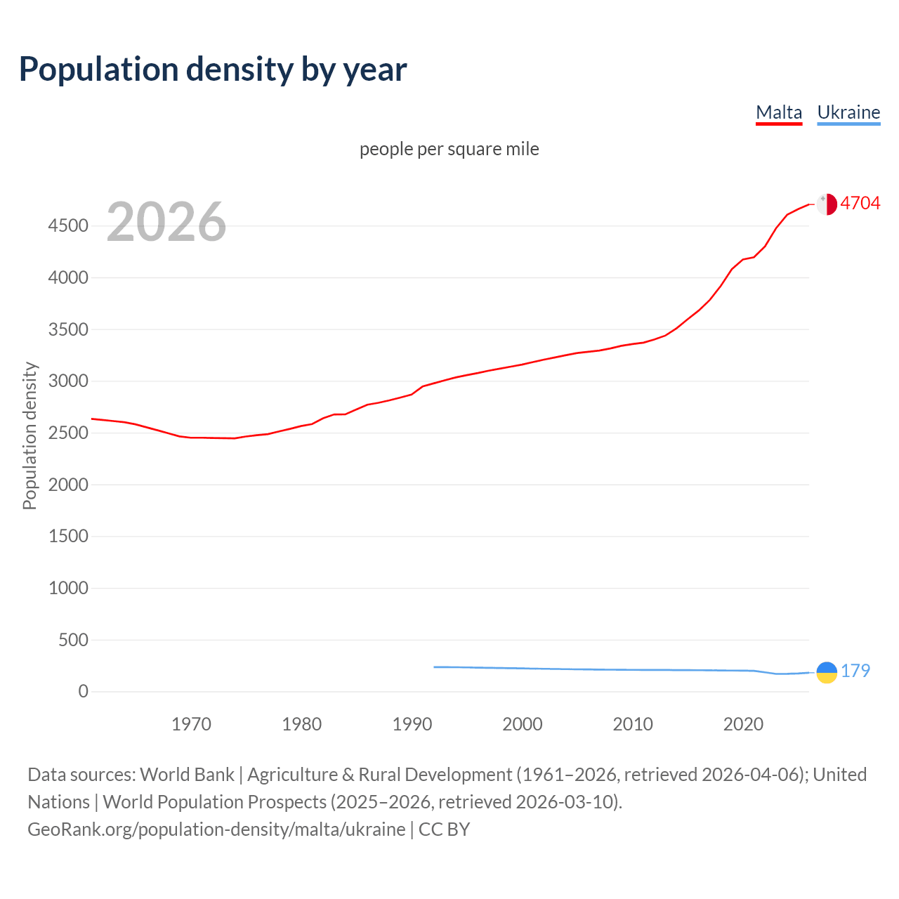 From 2006 to 2026, population density in Malta increased by 43.4%, compared to a 15.1% decline in Ukraine.