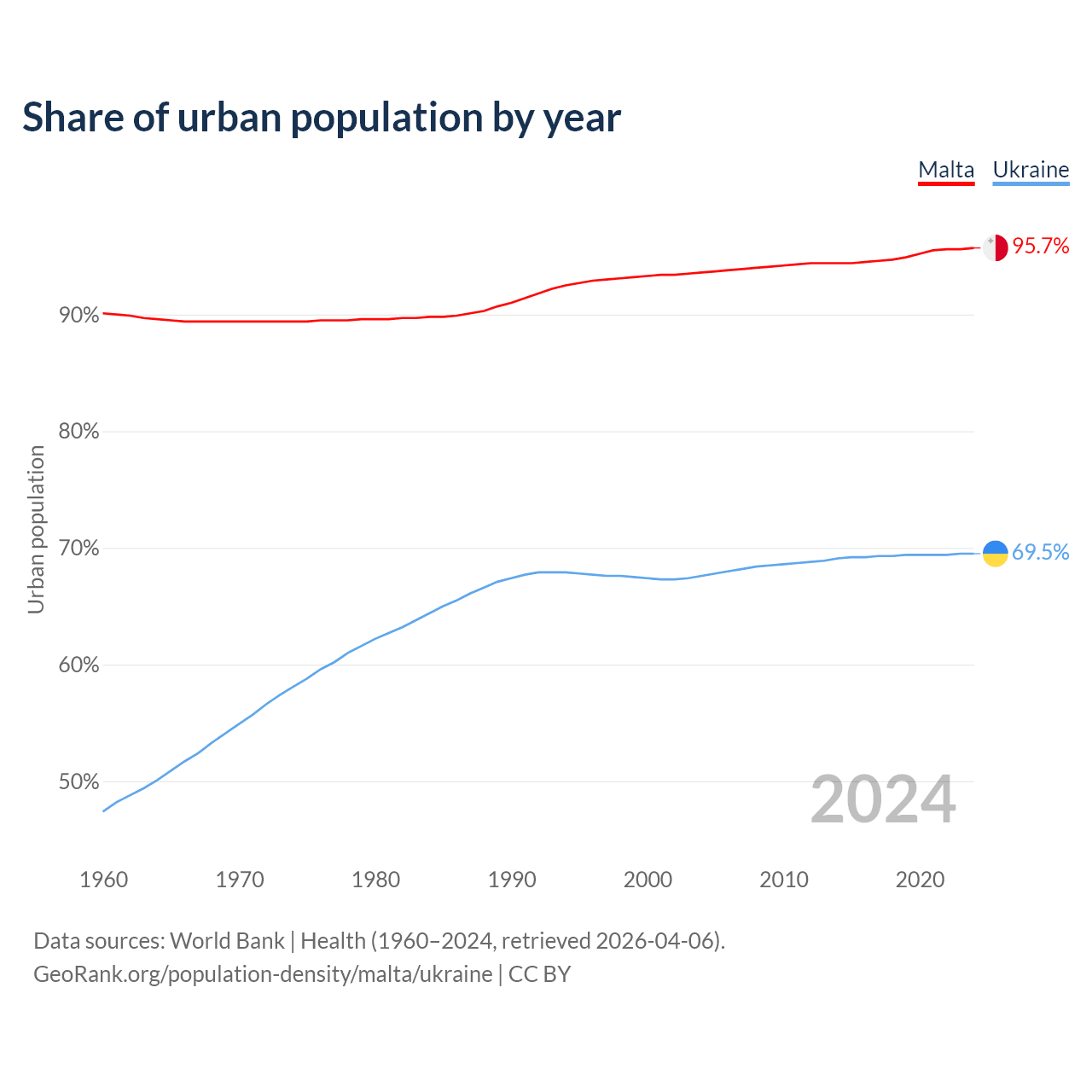 From 2004 to 2024, the share of urban population changed from 93.6% to 95.7% in Malta and from 67.6% to 69.5% in Ukraine.