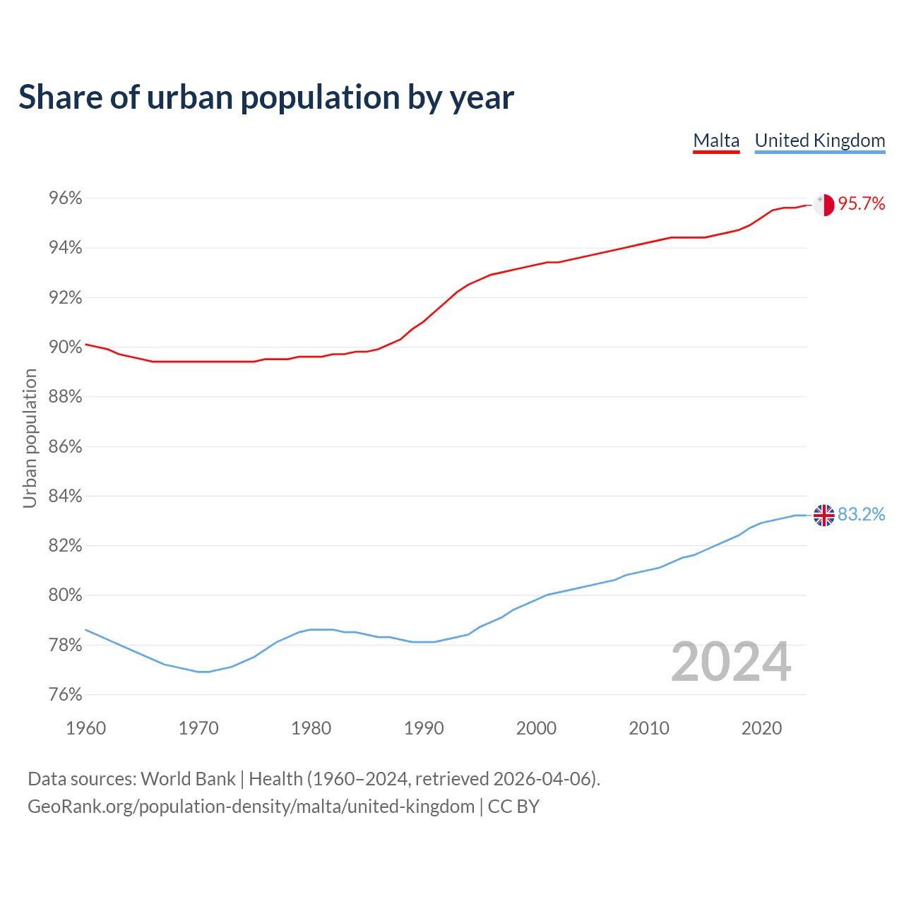 From 2004 to 2024, the share of urban population changed from 93.6% to 95.7% in Malta and from 80.3% to 83.2% in the United Kingdom.