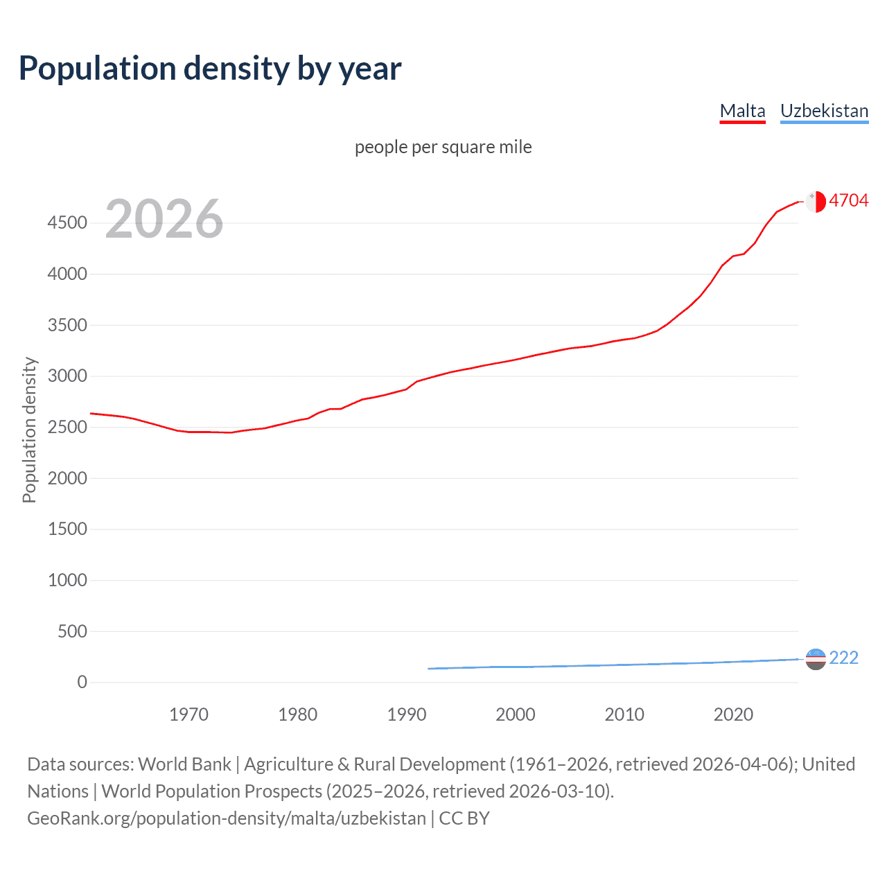 From 2006 to 2026, population density in Malta increased by 43.4%, compared to a 39.9% growth in Uzbekistan.