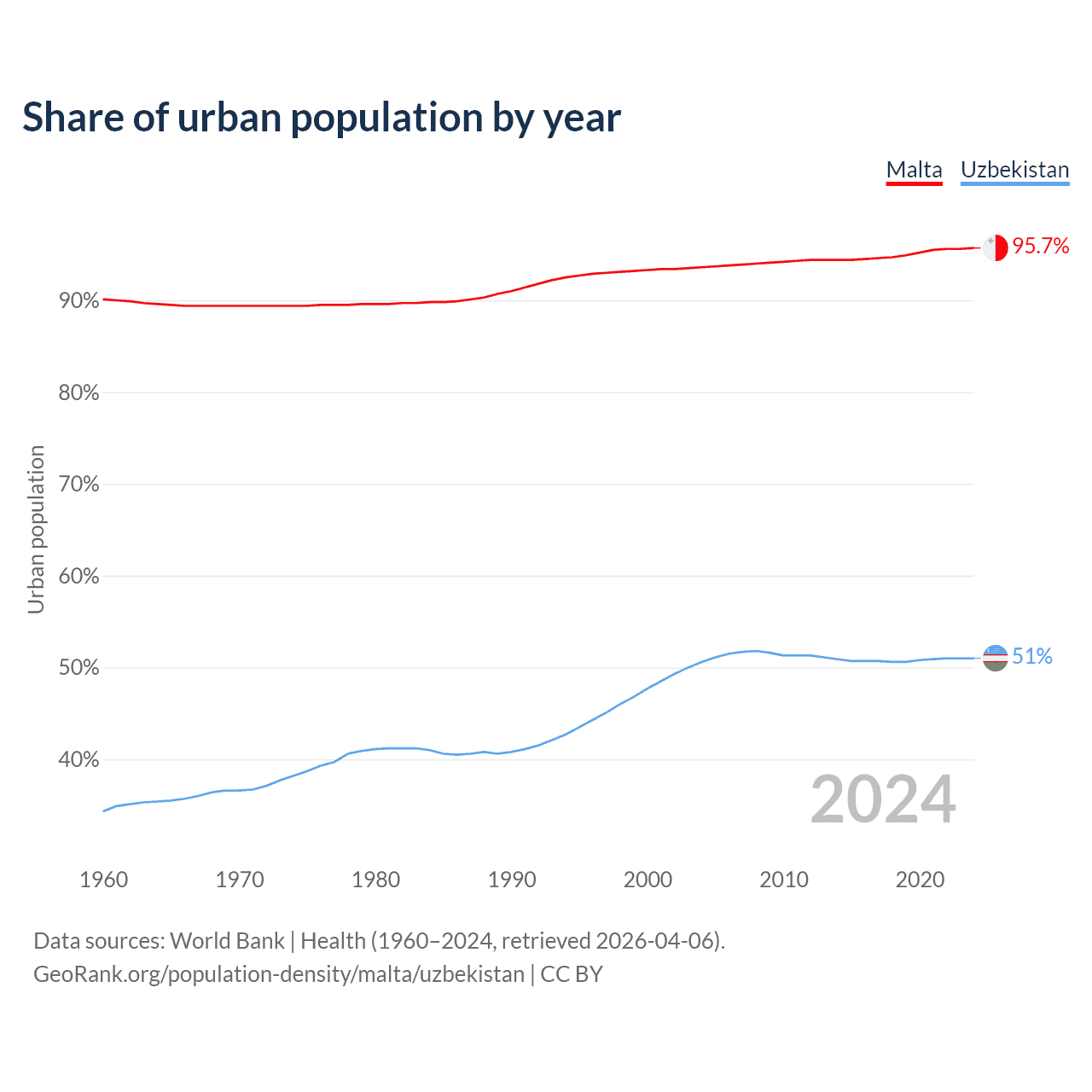 From 2004 to 2024, the share of urban population changed from 93.6% to 95.7% in Malta and from 50.6% to 51% in Uzbekistan.