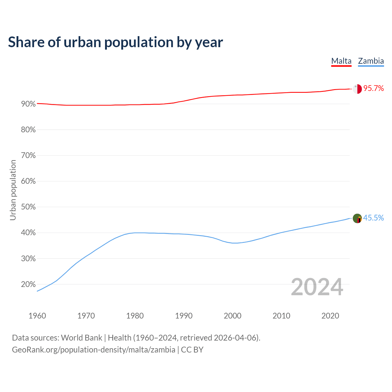 From 2004 to 2024, the share of urban population changed from 93.6% to 95.7% in Malta and from 36.8% to 45.5% in Zambia.