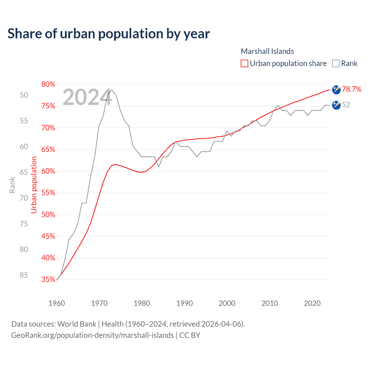 This chart shows the share of urban population in the Marshall Islands from 1960 to 2024: 34.8% lived in urban areas in 1960, 68.3% in 2000, and 78.7% in 2024.