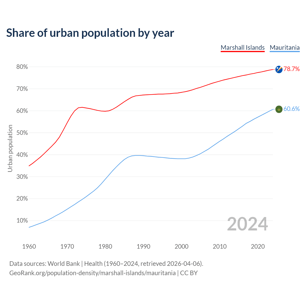 From 2004 to 2024, the share of urban population changed from 70.1% to 78.7% in the Marshall Islands and from 39.6% to 60.6% in Mauritania.