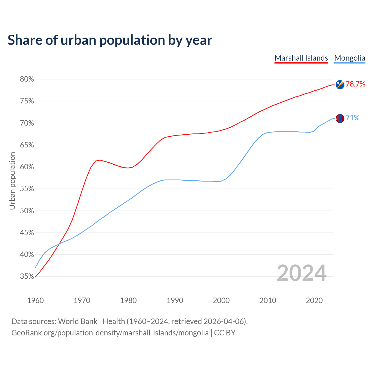 From 2004 to 2024, the share of urban population changed from 70.1% to 78.7% in the Marshall Islands and from 60.8% to 71% in Mongolia.