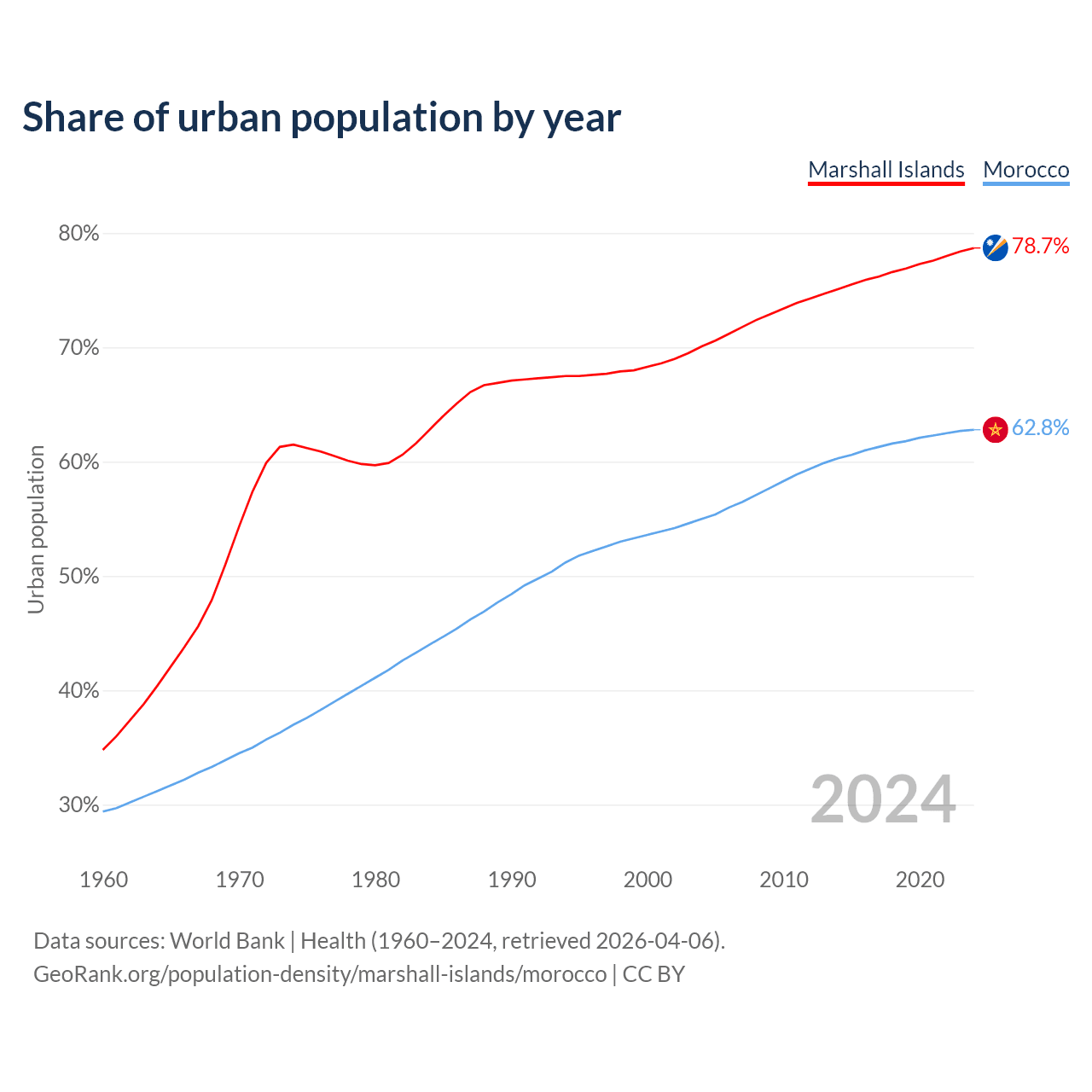 From 2004 to 2024, the share of urban population changed from 70.1% to 78.7% in the Marshall Islands and from 55% to 62.8% in Morocco.
