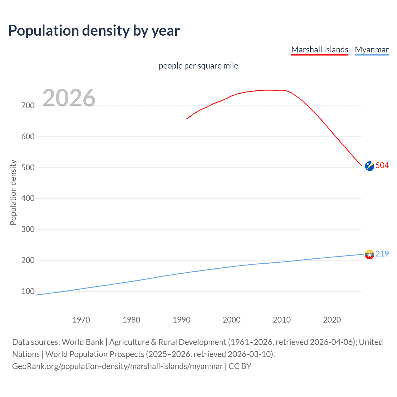 From 2006 to 2026, population density in the Marshall Islands decreased by 32.6%, compared to a 15.7% growth in Myanmar.