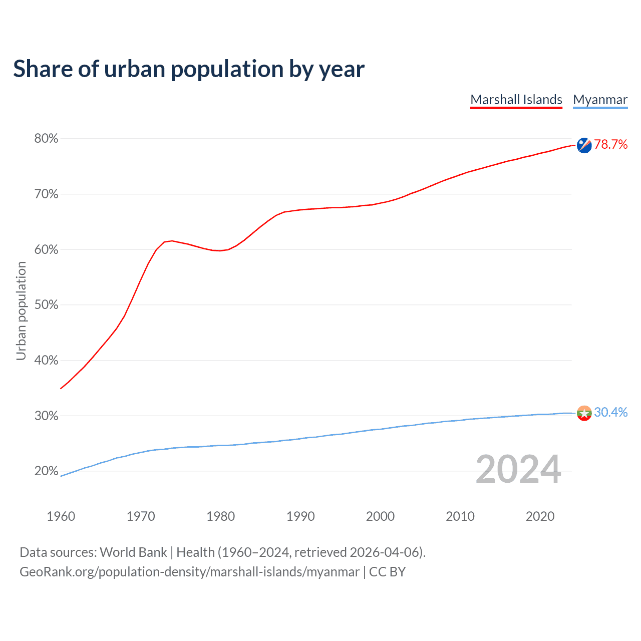 From 2004 to 2024, the share of urban population changed from 70.1% to 78.7% in the Marshall Islands and from 28.2% to 30.4% in Myanmar.