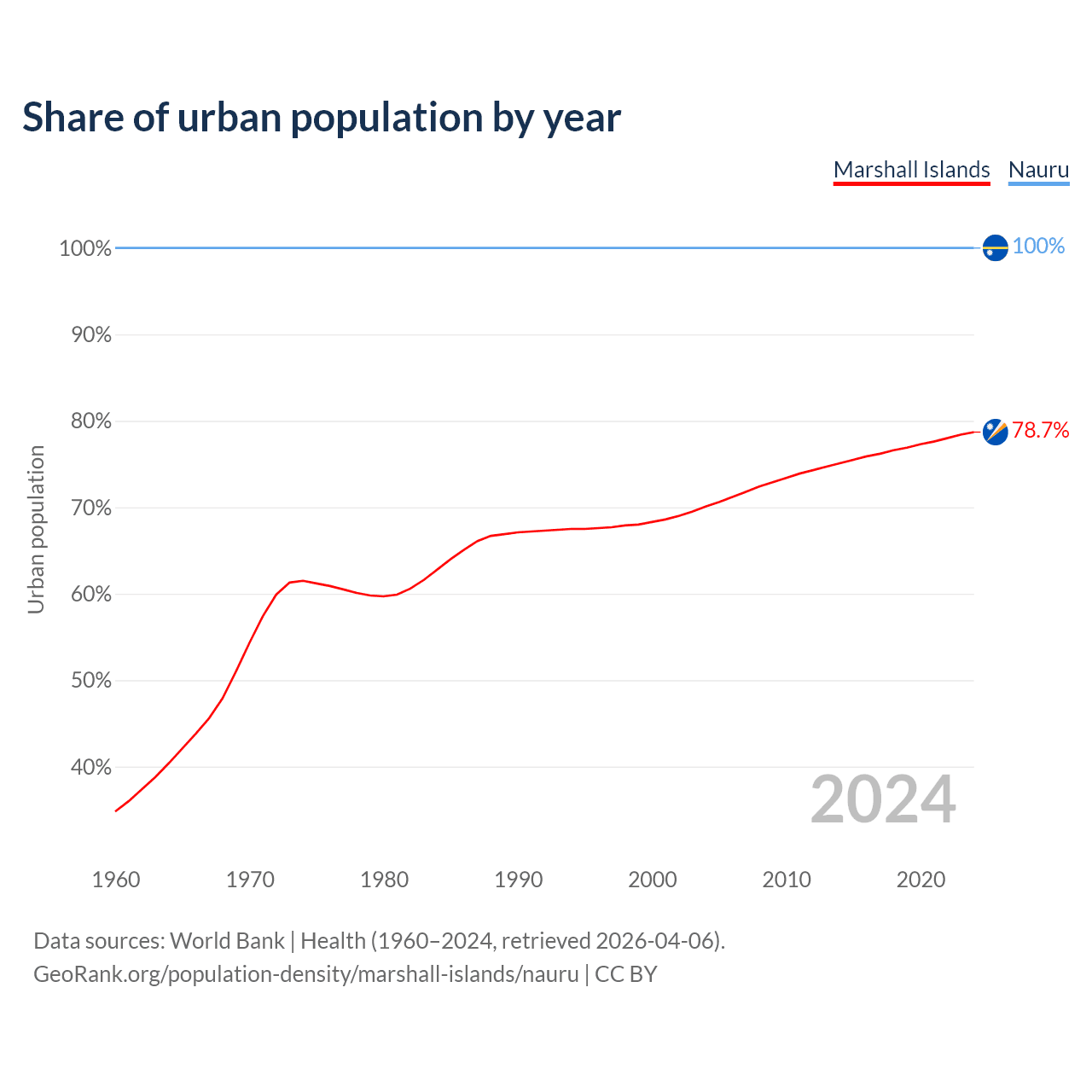From 2004 to 2024, the share of urban population changed from 70.1% to 78.7% in the Marshall Islands and from 100% to 100% in Nauru.