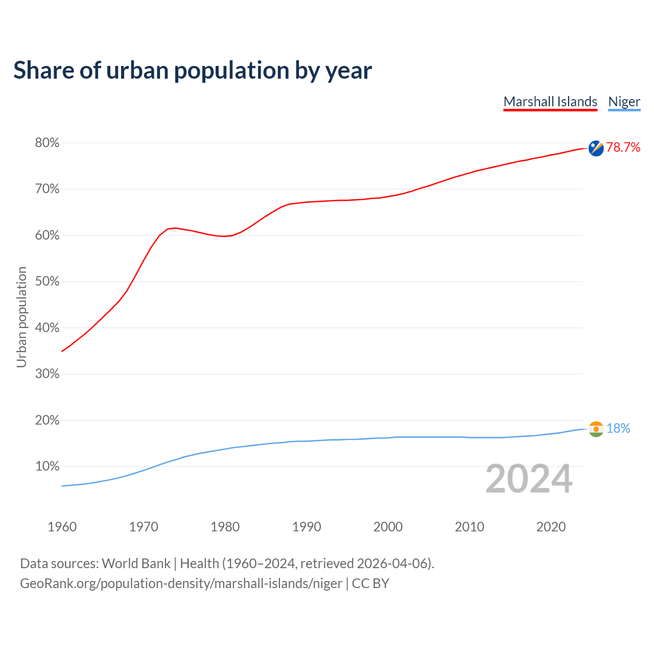 From 2004 to 2024, the share of urban population changed from 70.1% to 78.7% in the Marshall Islands and from 16.3% to 18% in Niger.