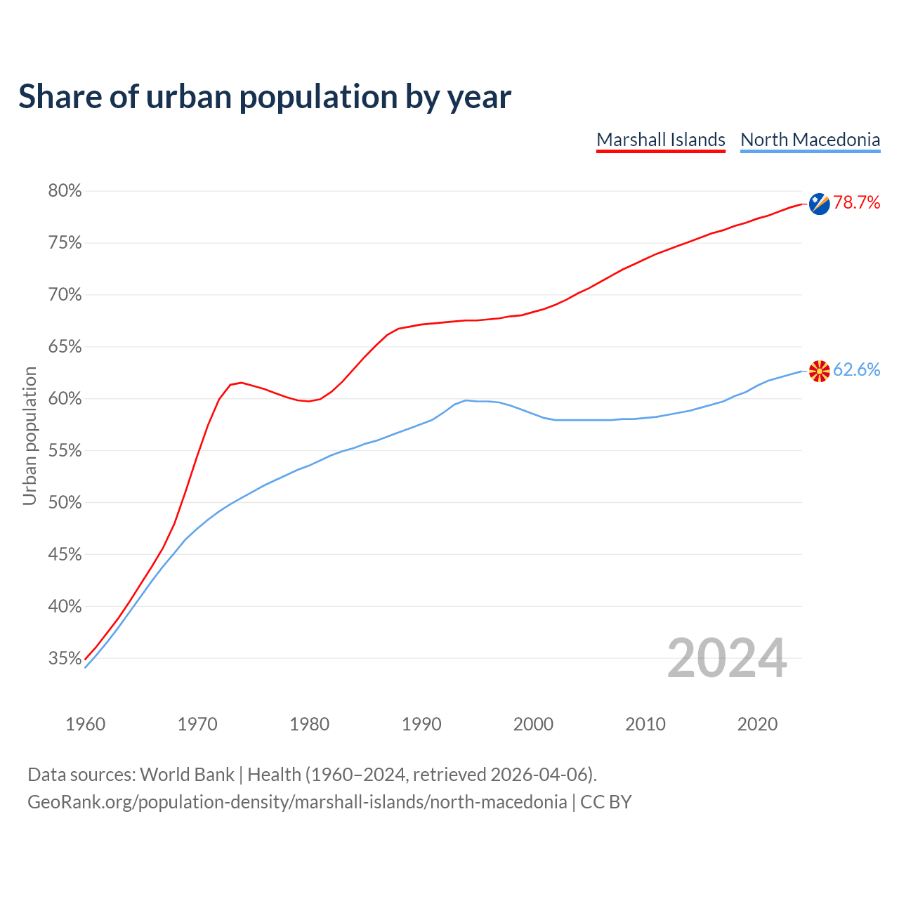 From 2004 to 2024, the share of urban population changed from 70.1% to 78.7% in the Marshall Islands and from 57.9% to 62.6% in North Macedonia.