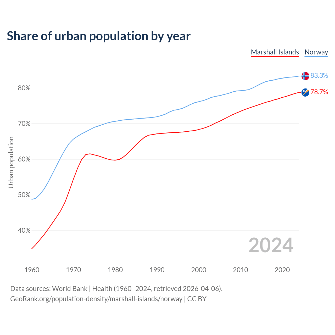 From 2004 to 2024, the share of urban population changed from 70.1% to 78.7% in the Marshall Islands and from 77.6% to 83.3% in Norway.