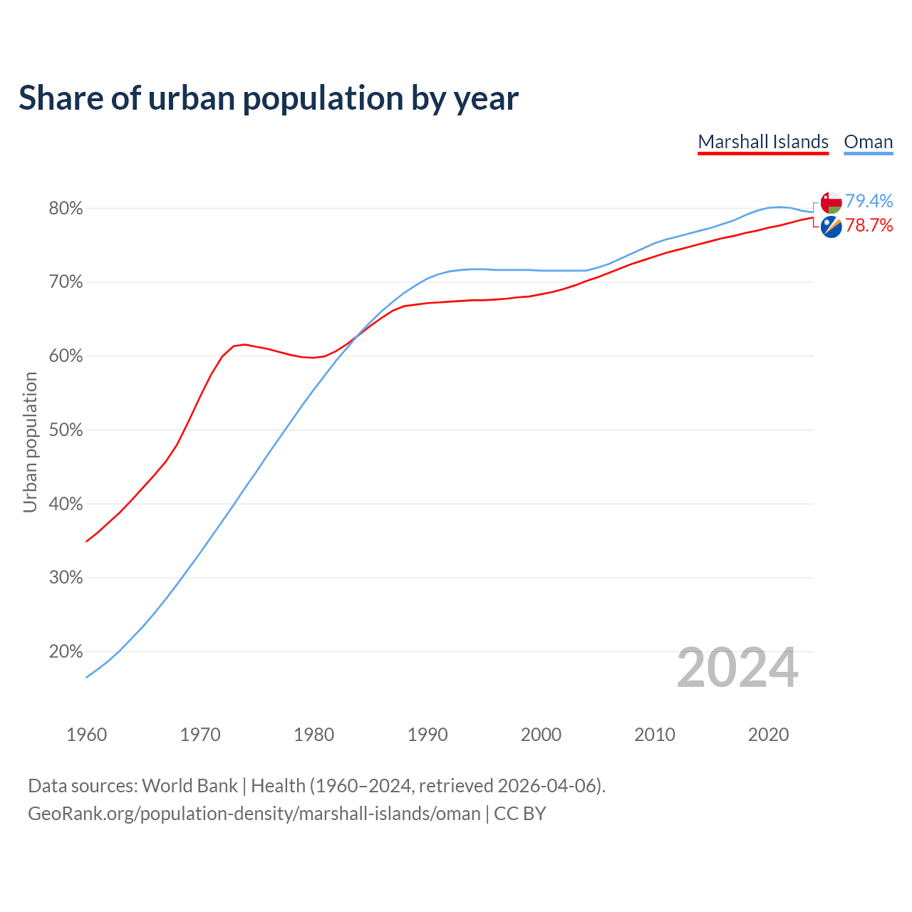 From 2004 to 2024, the share of urban population changed from 70.1% to 78.7% in the Marshall Islands and from 71.5% to 79.4% in Oman.