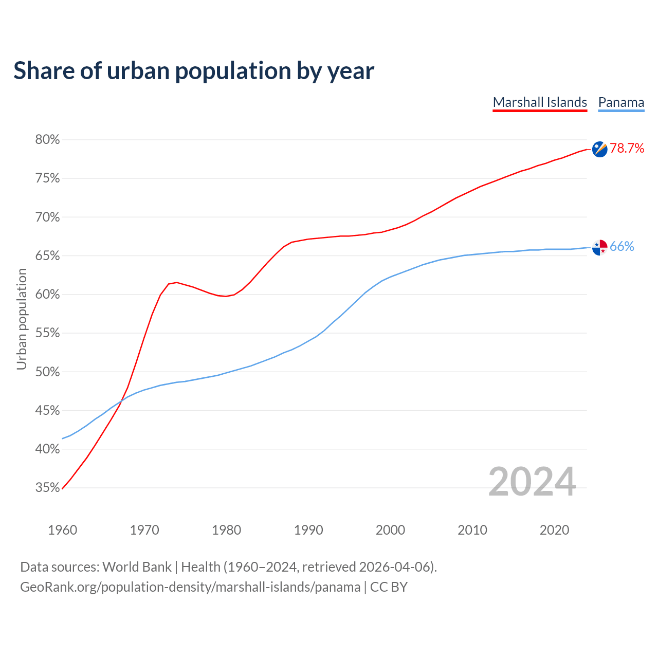 From 2004 to 2024, the share of urban population changed from 70.1% to 78.7% in the Marshall Islands and from 63.8% to 66% in Panama.