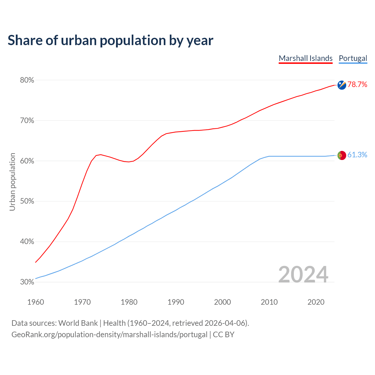 From 2004 to 2024, the share of urban population changed from 70.1% to 78.7% in the Marshall Islands and from 57.4% to 61.3% in Portugal.