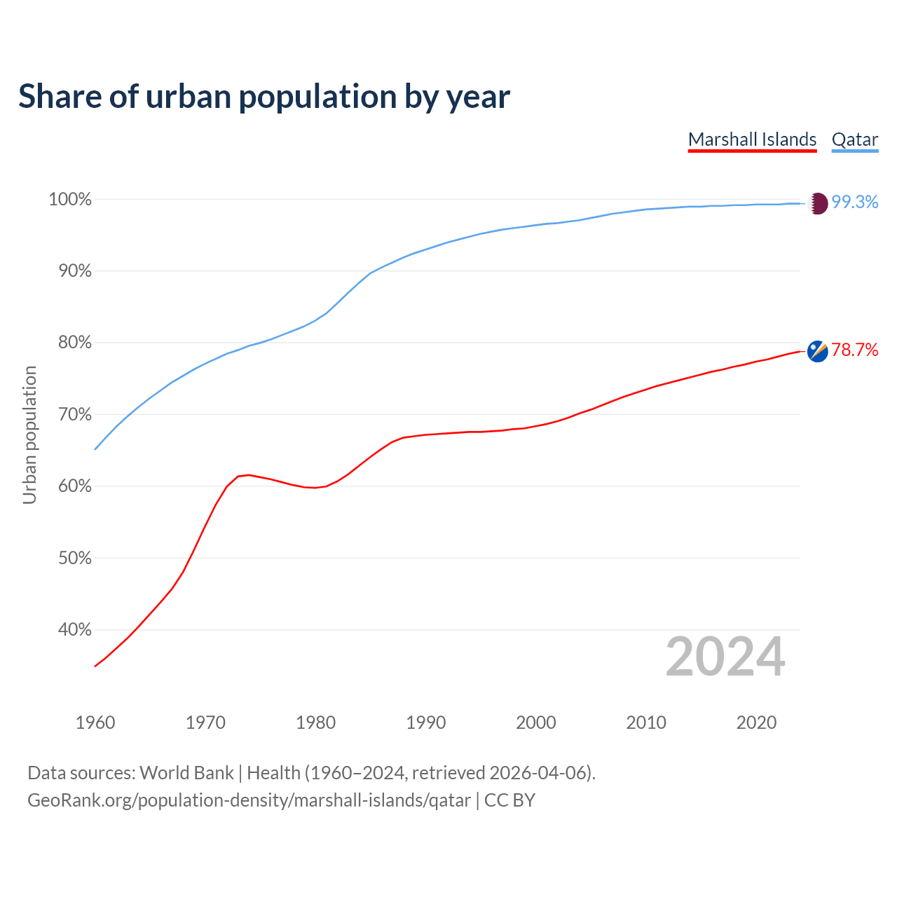 From 2004 to 2024, the share of urban population changed from 70.1% to 78.7% in the Marshall Islands and from 97% to 99.3% in Qatar.