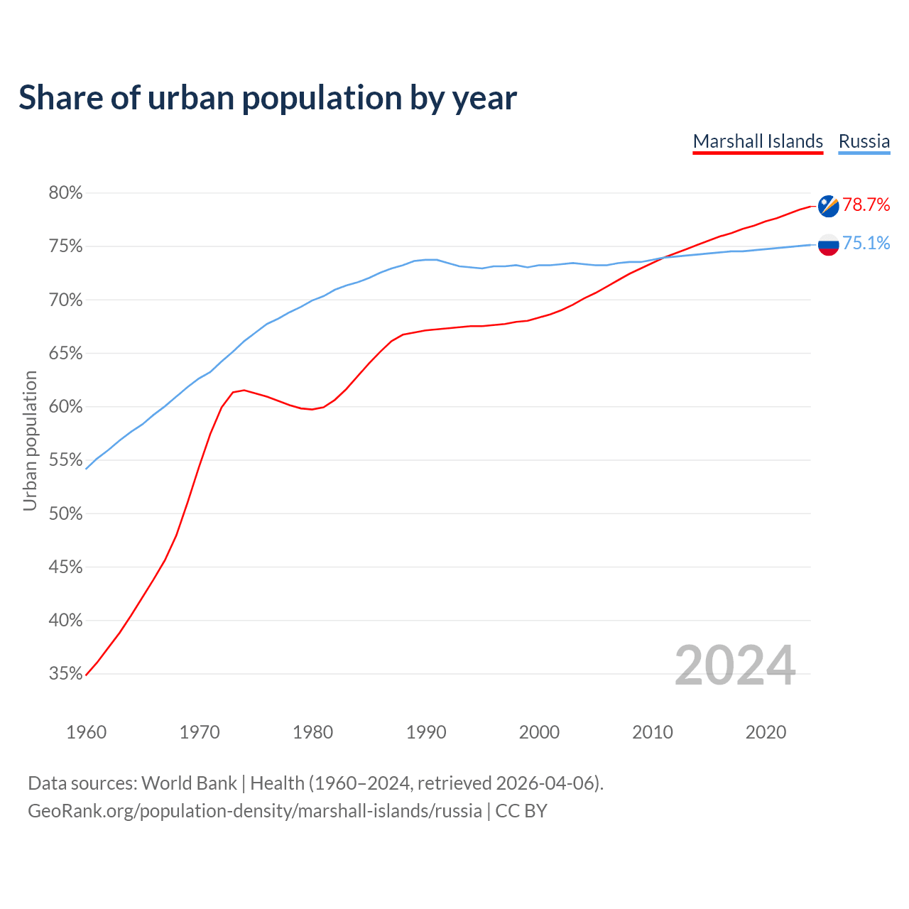 From 2004 to 2024, the share of urban population changed from 70.1% to 78.7% in the Marshall Islands and from 73.3% to 75.1% in Russia.
