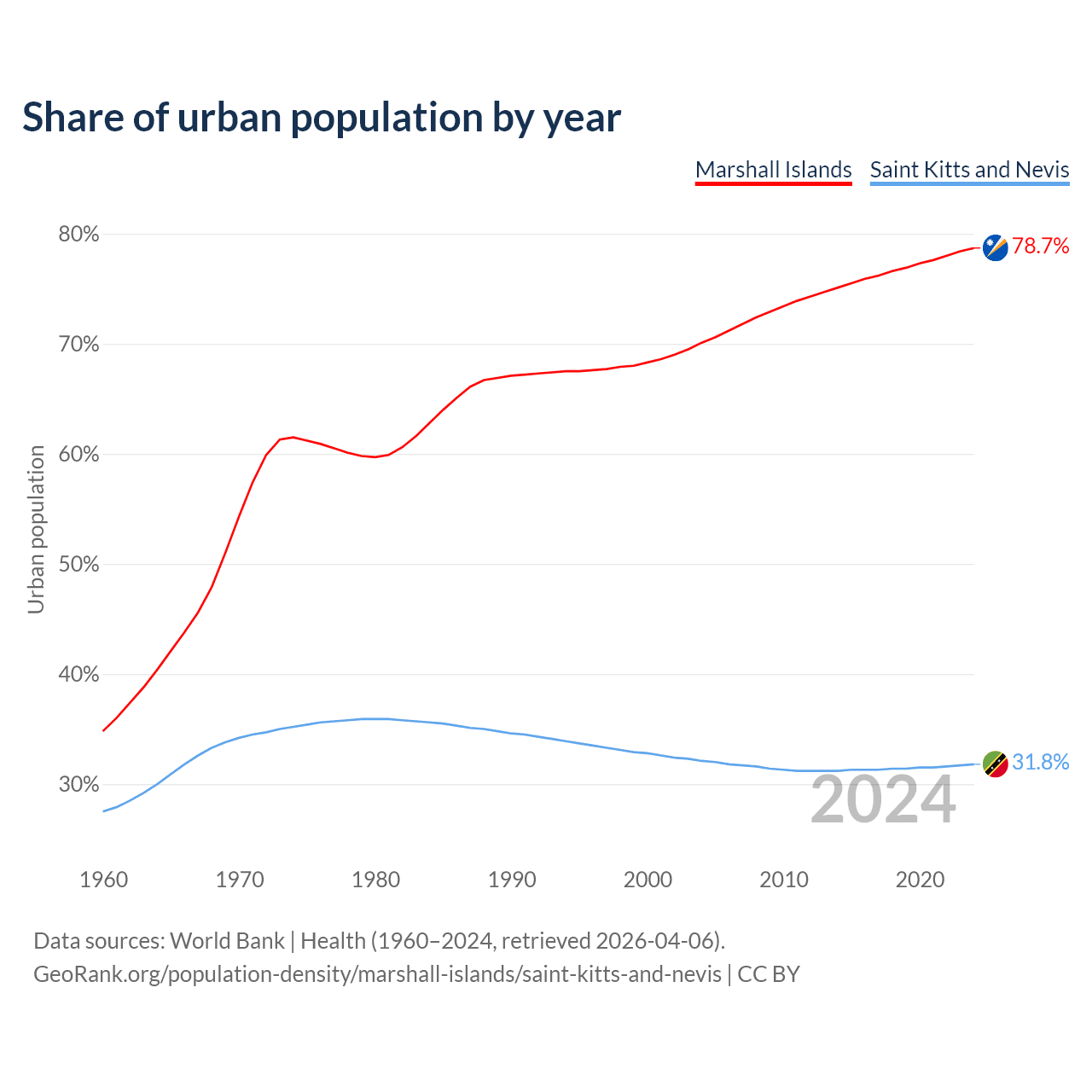 From 2004 to 2024, the share of urban population changed from 70.1% to 78.7% in the Marshall Islands and from 32.1% to 31.8% in Saint Kitts and Nevis.