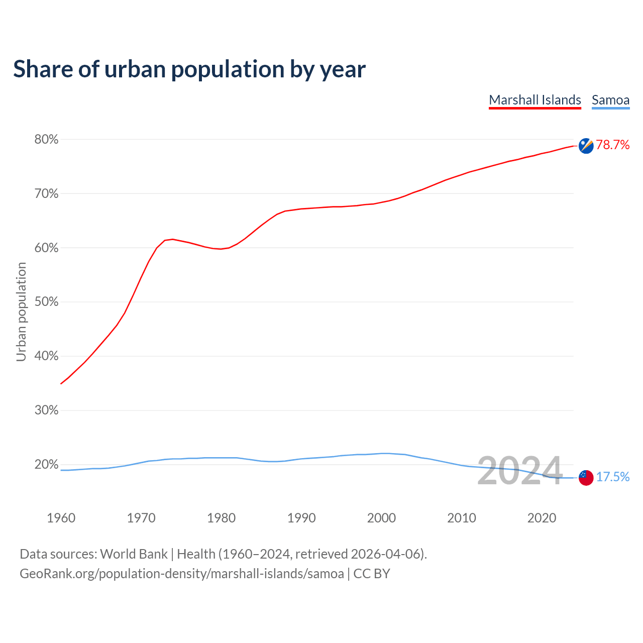 From 2004 to 2024, the share of urban population changed from 70.1% to 78.7% in the Marshall Islands and from 21.5% to 17.5% in Samoa.