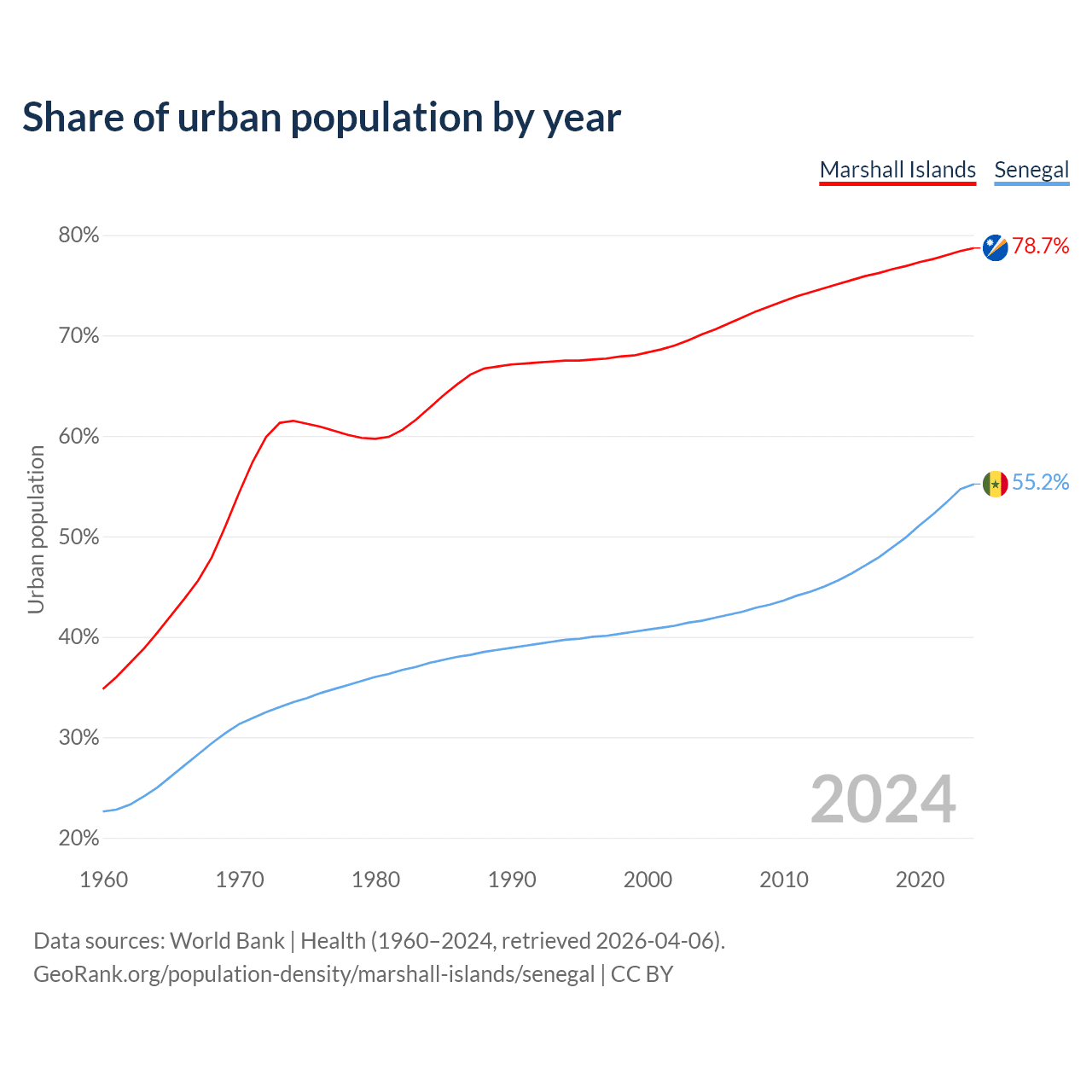 From 2004 to 2024, the share of urban population changed from 70.1% to 78.7% in the Marshall Islands and from 41.6% to 55.2% in Senegal.