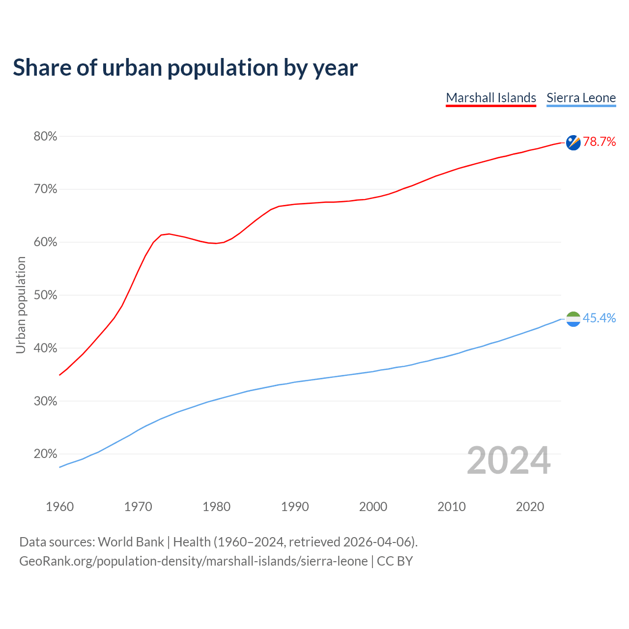 From 2004 to 2024, the share of urban population changed from 70.1% to 78.7% in the Marshall Islands and from 36.5% to 45.4% in Sierra Leone.