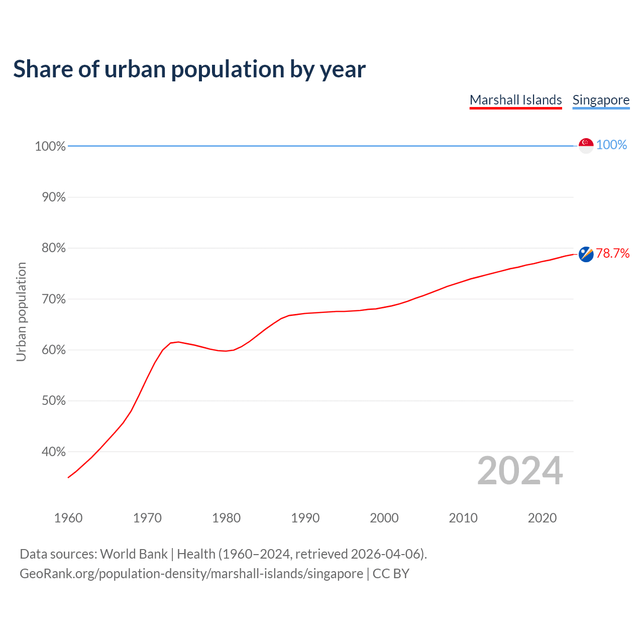 From 2004 to 2024, the share of urban population changed from 70.1% to 78.7% in the Marshall Islands and from 100% to 100% in Singapore.