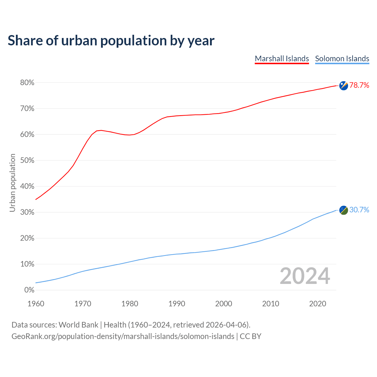 From 2004 to 2024, the share of urban population changed from 70.1% to 78.7% in the Marshall Islands and from 17.2% to 30.7% in the Solomon Islands.