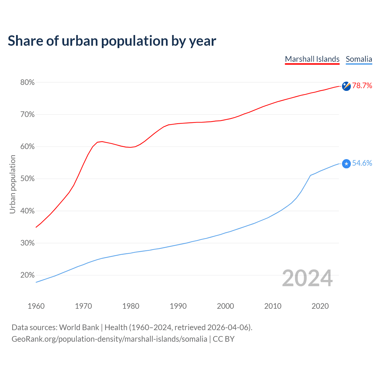 From 2004 to 2024, the share of urban population changed from 70.1% to 78.7% in the Marshall Islands and from 35% to 54.6% in Somalia.