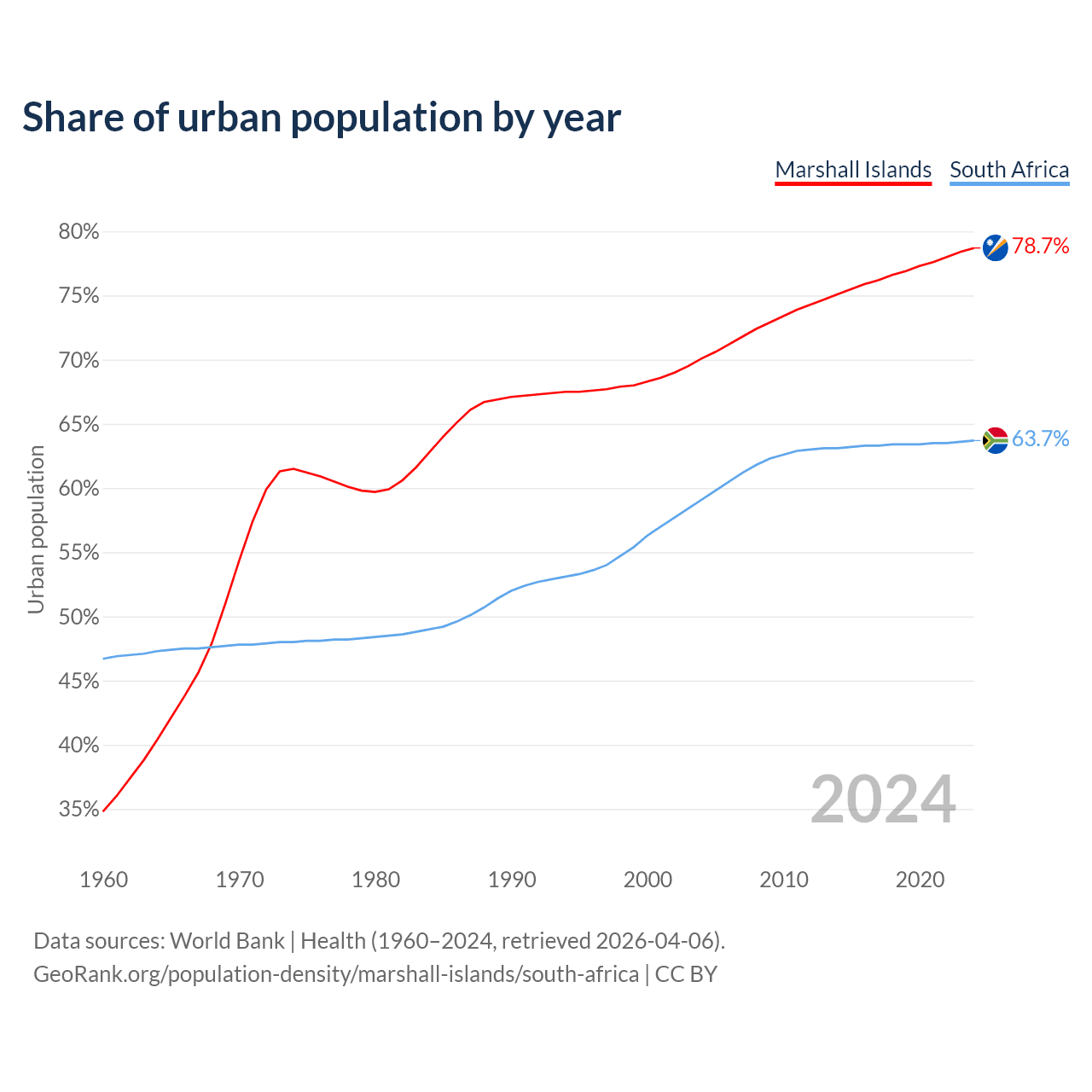 From 2004 to 2024, the share of urban population changed from 70.1% to 78.7% in the Marshall Islands and from 59.1% to 63.7% in South Africa.