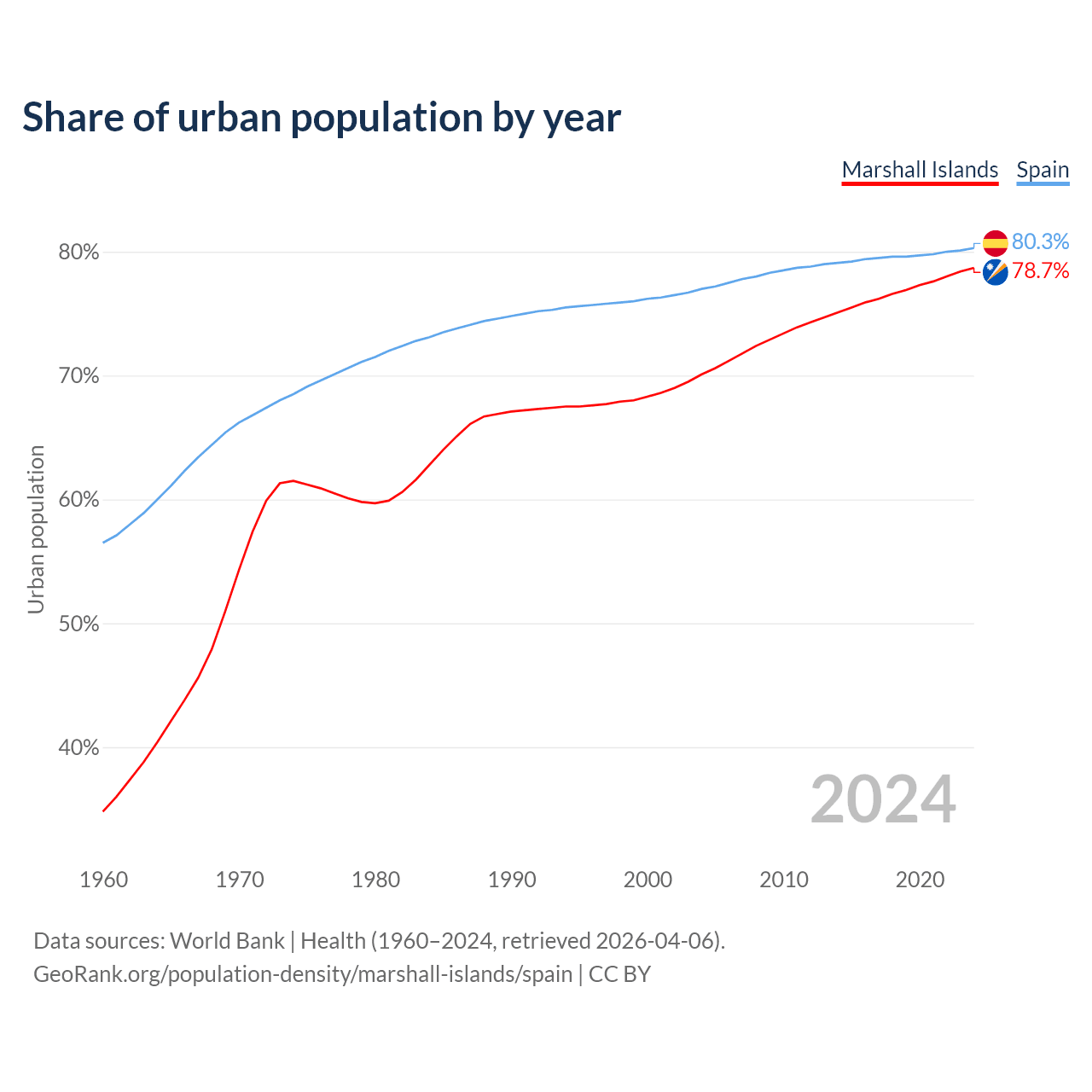 From 2004 to 2024, the share of urban population changed from 70.1% to 78.7% in the Marshall Islands and from 77% to 80.3% in Spain.
