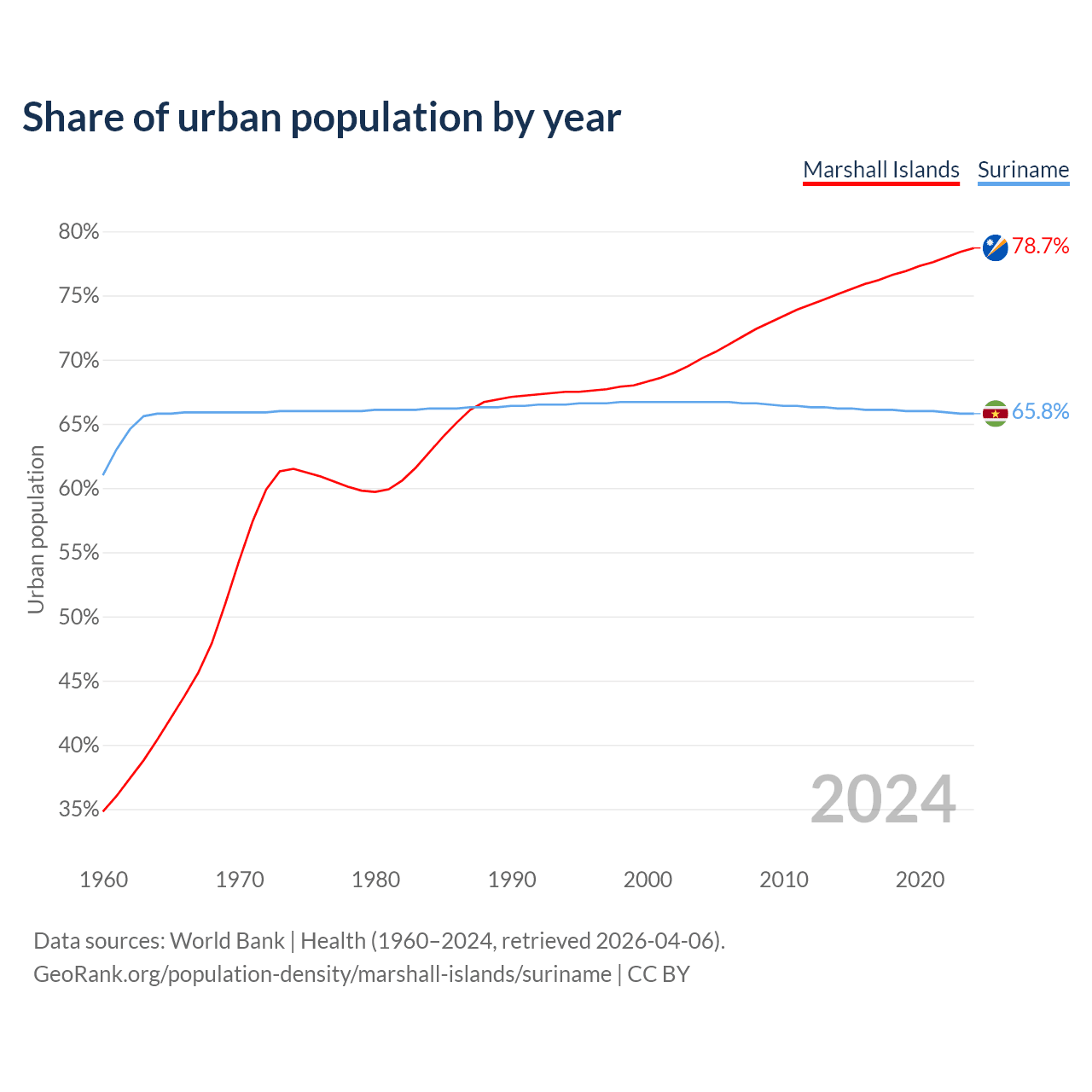 From 2004 to 2024, the share of urban population changed from 70.1% to 78.7% in the Marshall Islands and from 66.7% to 65.8% in Suriname.